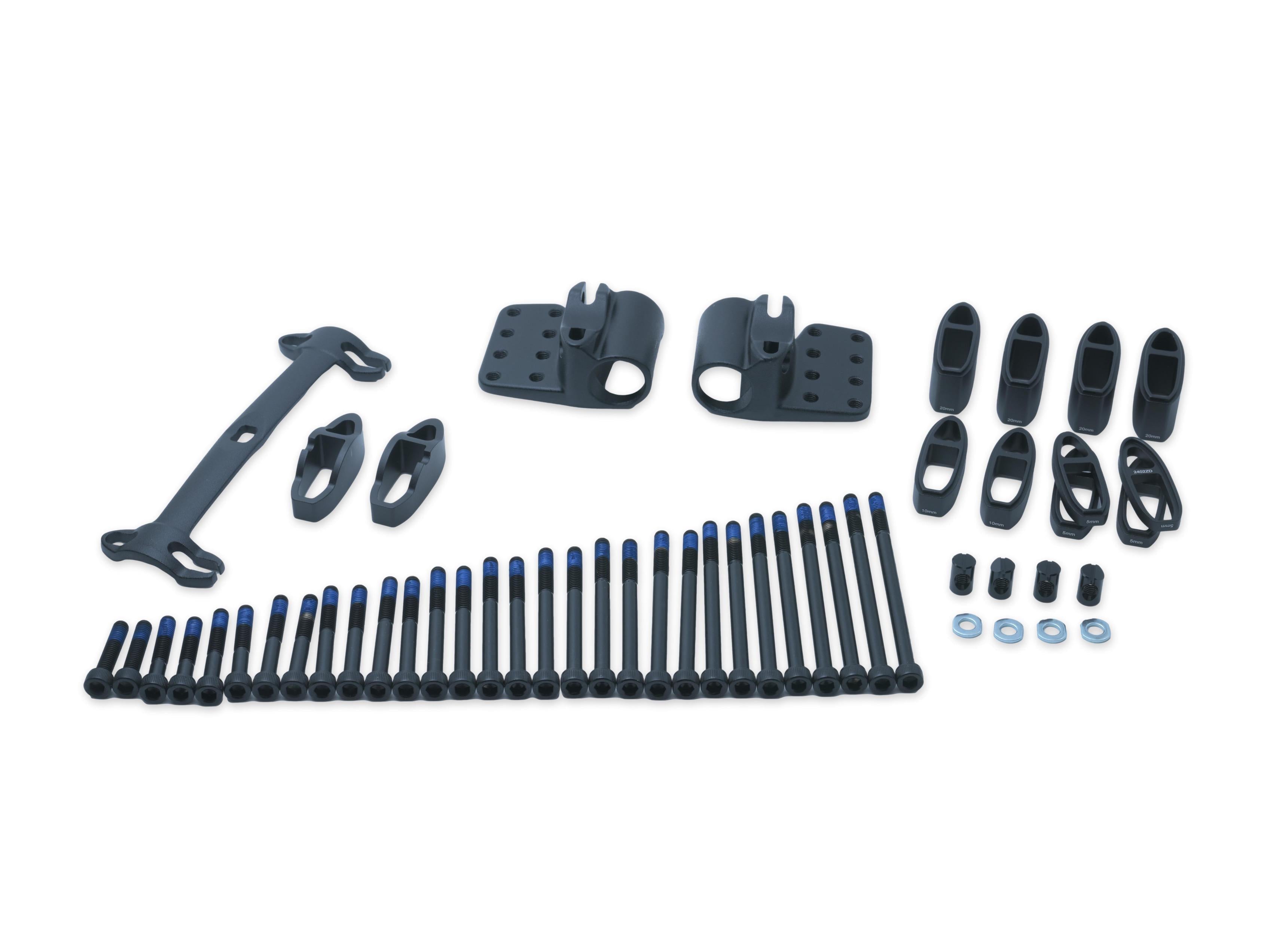 Complete set: brackets; adaptors ; 2x 5mm riser ; 2x 10mm riser ; 4x 20mm riser ; all bolts.